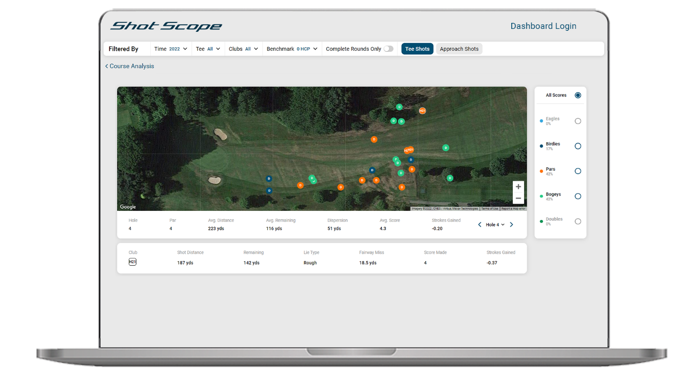 Shot Scope continues to offer new ways in which golfers can analyse their rounds at their home course or one they have played multiple times – creating a visual map of how to play every hole on the course. From where you make birdies, to where you have struggled with bogeys, this new feature allows you to identify the best strategy to play the hole – maximising your chances of a low scoring round.With a new way to visualise performance, users will have the ability to delve into their golf game in as little or as much detail as they want. With a variety of filters available, the tool is there to assist golfers in the way that benefits them the most. Individual club used, end location of the shot, score, and an individual strokes gained benchmark score are some of the filters that can be applied so that golfers can analyse their game through a different lens each time.